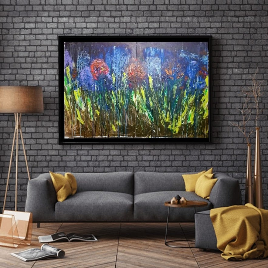 This is the largest piece offered. A depiction in mixed media of rain on a blooming garden, This diptych is two 30x40 pieces grouped together