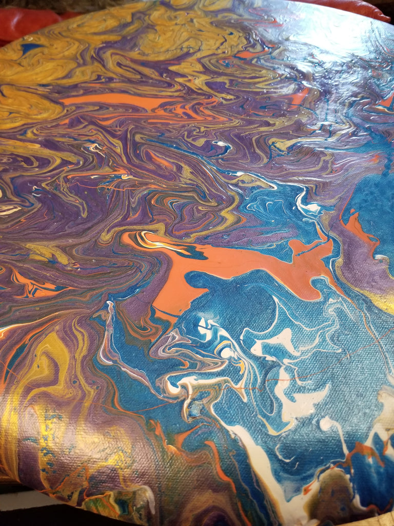Acrylic pour of various metalic paints on a Fredricks heavy duty circular canvas.