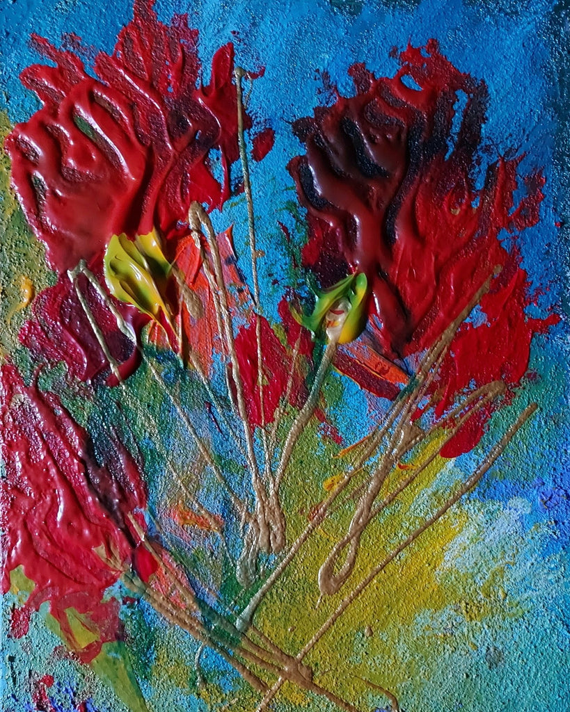 Granulated ground and thick acrylic impasto give this piece a 3D dimension