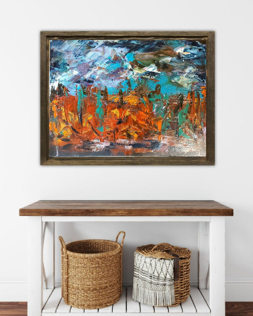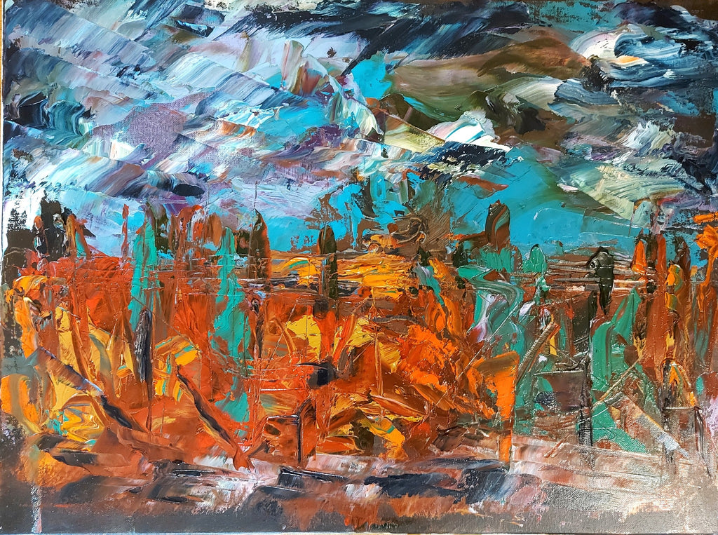 Expressionist oil sketch of Ontario landscape. Foretelling Fall.